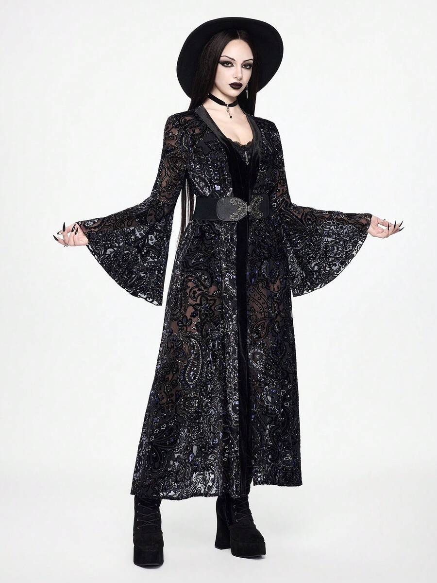 Goth فستان أنيق أنثوي بأكمام طويلة وظهر مكشوف مطرز بلون أحادي